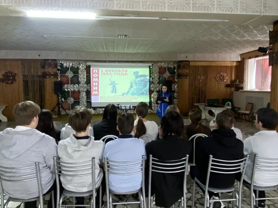 3 февраля в «СДК ст. Привольной» прошёл видео лекторий, посвященный «Дню разгрома советскими войсками немецко-фашистских войск в Сталинградской битве в рамках «Дня воинской славы России» — для учащихся восьмого «Б» класса СОШ №13.